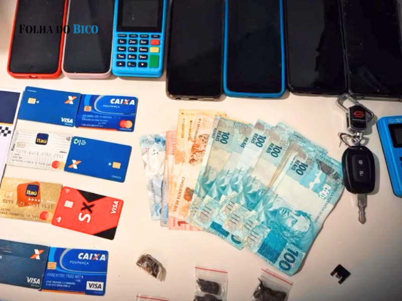 Durante a abordagem, a Polícia Militar encontrou com o grupo R$ 1.886,00 em espécie, dez cartões bancários em nome de terceiros, quatro porções de maconha, duas maquinetas de cartão, seis celulares, além de instrumentos utilizados na fraude, como clipe e tesoura. O cartão da vítima foi recuperado. O homem preso tem 41 anos e possui um mandado de prisão em aberto, além de antecedentes por roubo; as mulheres, de 40 e 36 anos, têm passagens por estelionato. O trio é investigado por aplicar golpes em diversos estados, como Pará e Maranhão, com foco em vítimas idosas e mulheres. Os detidos e o material apreendido foram encaminhados à Central de Flagrantes de Araguatins para os procedimentos legais.