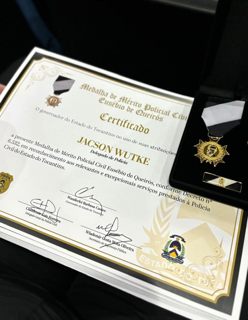 “É com muita honra que, na data de hoje, em evento realizado no Palácio do Araguaia, tive a grata satisfação de ser condecorado pelo governador Wanderlei Barbosa; vice-governador Laurez Moreira; pelo secretário de Estado da Segurança Pública, Wlademir Mota Oliveira e por outras autoridades e parlamentares com a Medalha do Mérito Eusébio de Queiroz, em razão dos relevantes e excepcionais serviços prestados à Segurança Pública do Estado do Tocantins, em especial em nossa querida Augustinópolis”, disse Jacson Wutke em entrevista ao jornal Folha do Bico .