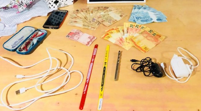 Em um carro a paisana estacionado a poucos metros do local do encontro, foi possível aos policiais civis acompanhar toda a ação criminosa e, no momento em que foram repassados os possíveis objetos ligados ao crime, parte da equipe policial realizou a abordagem tática e busca pessoal do suspeito, encontrando em seu poder R$ 1.600,00 (mil e seiscentos reais), que foi recebido a título de propina e estava em um dos bolsos da calça, além de uma caixa de sapato que continha um aparelho celular, dois carregadores, duas ceguetas, uma broca de furadeira e diversos papéis com possíveis telefones de integrantes da organização criminosa e prestações de contas da criminalidade. Uma vez constatada a materialidade, foi dada voz de prisão, adotando-se os procedimentos cabíveis.