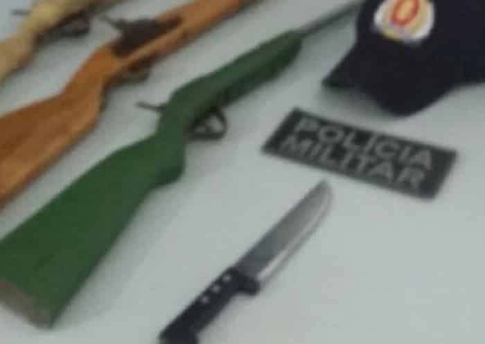 Com a chegada da PM o autor conseguiu fugir deixando as armas para trás a faca e as espingardas de fabricação artesanais. As armas apreendidas foram entregues na Delegacia de Polícia para as providências cabíveis. (Ascom 9 BPM)