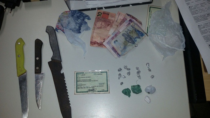 Na tarde deste domingo, 24, dois adultos e cinco adolescentes foram flagrados pela Polícia Militar comercializando drogas na praça do mercado municipal, bairro Boa Vista, em Augustinópolis. A PM foi informada anonimamente de que um grupo de jovens estava vendendo drogas no local e saiu em diligências para verificar a denúncia, sendo que após buscas nos envolvidos encontrou 13 pedras de crack com kairo Pereira de Assis e uma porção de maconha com Jefferson Vieira dos Santos, ambos com 18 anos. Com eles, ainda foram encontradas três facas e uma quantia de 37 reais. Todo o entorpecente já estava embalado pronto para comercialização.