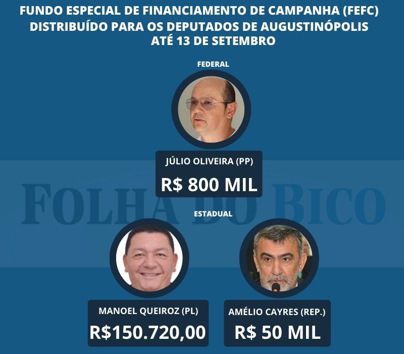 Em Augustinópolis, um dos principais municípios do Bico do Papagaio, que conta com três candidatos, sendo um federal, Júlio Oliveira (PP) e dois estaduais Manoel Queiros (PL) e Amélio Cayres (Republicanos), o recebimento de recursos para campanha proveniente do Fundo Especial de Financiamento de Campanha (FEFC), popular Fundão Eleitoral, já ultrapassam o R$ 1 milhão.