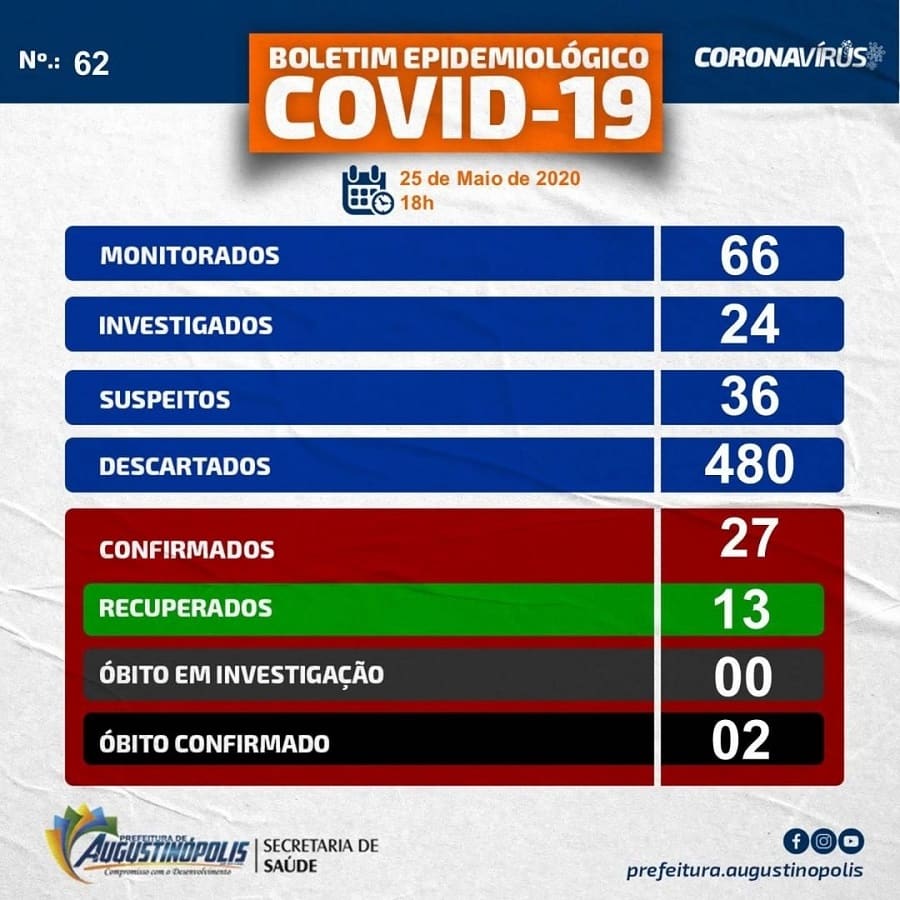 Nesta segunda, 25, segundo dados do Boletim Epidemiológico da Secretaria Municipal de Saúde, divulgados no início da noite, mostram que o registro do número de casos de Covid-19, em Augustinópolis, satou de 25 para 27, um crescimento de 8% nas últimas 24 horas.