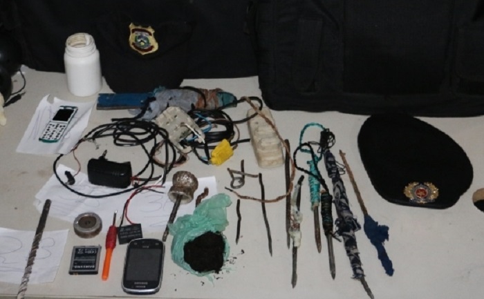 Foram apreendidos doze chuchus, uma broca, uma faca artesanal, uma porção de fumo, dois celulares, dois mergulhões, dois carregadores e uma talhadeira artesanal. (Foto: Paulo Palmares e Ascom PM)