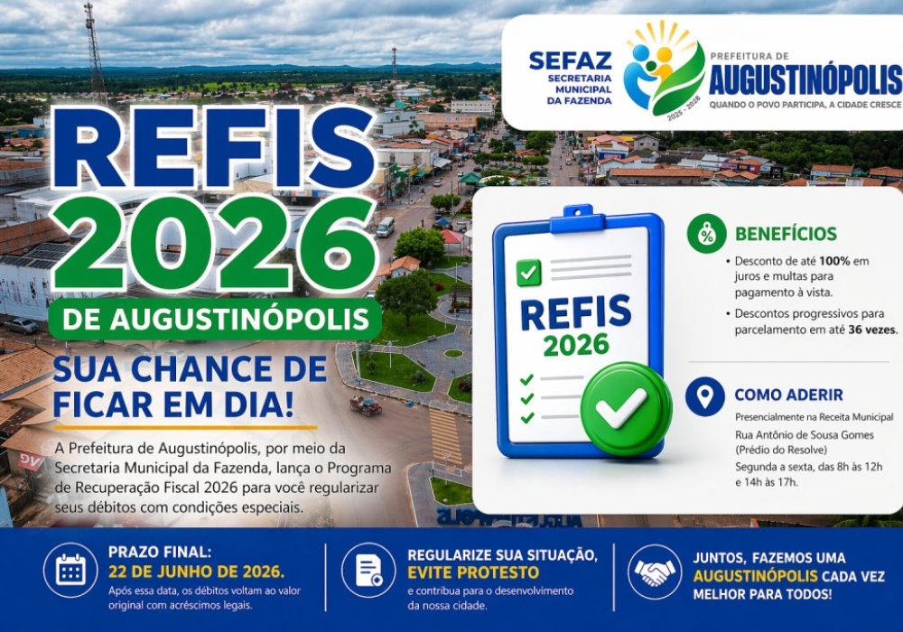 A Prefeitura de Augustinópolis lançou, nesta semana, o Programa de Recuperação Fiscal (REFIS 2026), com foco na regularização de débitos municipais e no fortalecimento da arrecadação local. A iniciativa, coordenada pela Secretaria Municipal da Fazenda, oferece condições facilitadas para que contribuintes — pessoas físicas e jurídicas — quitem dívidas vencidas até 31 de dezembro de 2025, incluindo tributos como IPTU, ISS, ITBI e taxas diversas.