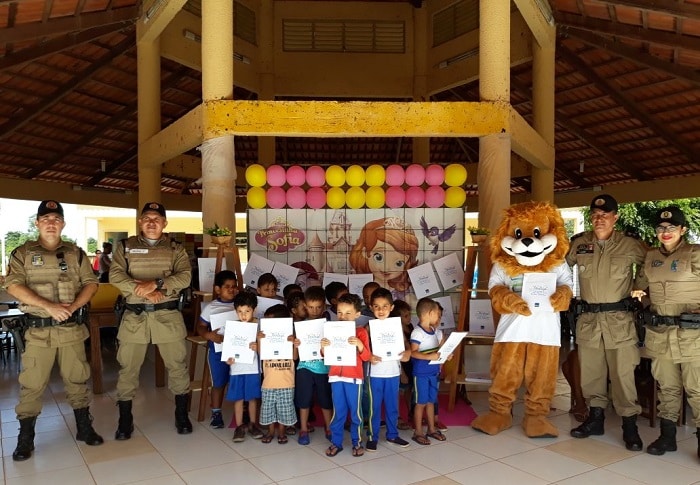 Na ocasião, cerca de 140 crianças de 4 e 5 anos, da Educação Infantil da Escola foram beneficiadas com quites de livros, enviados pela Coordenação Estadual do Proerd. O encerramento da festa para a garotada foi marcada com a presença do mascote do Proerd, o Leão DARE. (Ascom 9 BPM)