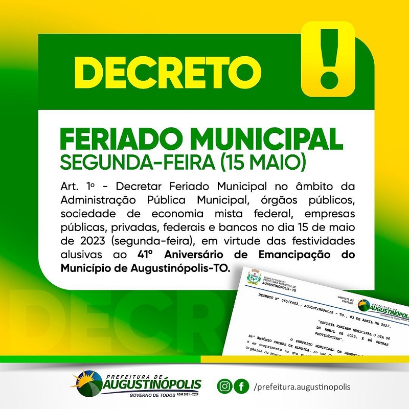 A Prefeitura Municipal decretou feriado municipal para a próxima segunda-feira, 15 de maio, um dia após, a data em que se comemora o 41º Aniversário de Emancipação Política do município.