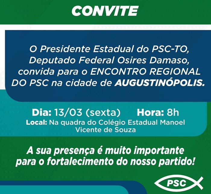 O evento será realizado nas diversas regiões do Estado e destinado para aqueles filiados ao PSC que têm intenção de concorrer à eleição deste ano como prefeito ou vereador. A primeira edição do “Encontro Regional do PSC” acontece na próxima sexta-feira, 13, às 8 horas, em Augustinópolis.