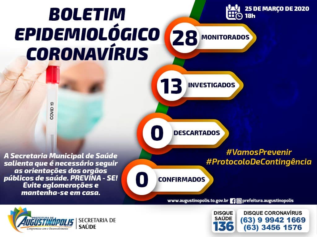 A Secretaria de Saúde de Augustinópolis divulgou o Boletim Epidemiológico desta quarta-feira, 25. Segundo o órgão, Augustinópolis tem 28 casos monitorados e 13 investigados. Nenhum confirmado.