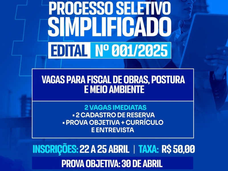 A Prefeitura Municipal de Augustinópolis, por meio do Edital nº 001/2025, anuncia a abertura de inscrições para o Processo Seletivo Simplificado com objetivo de contratar profissionais para o cargo de Fiscal de Obras, Postura e Meio Ambiente.