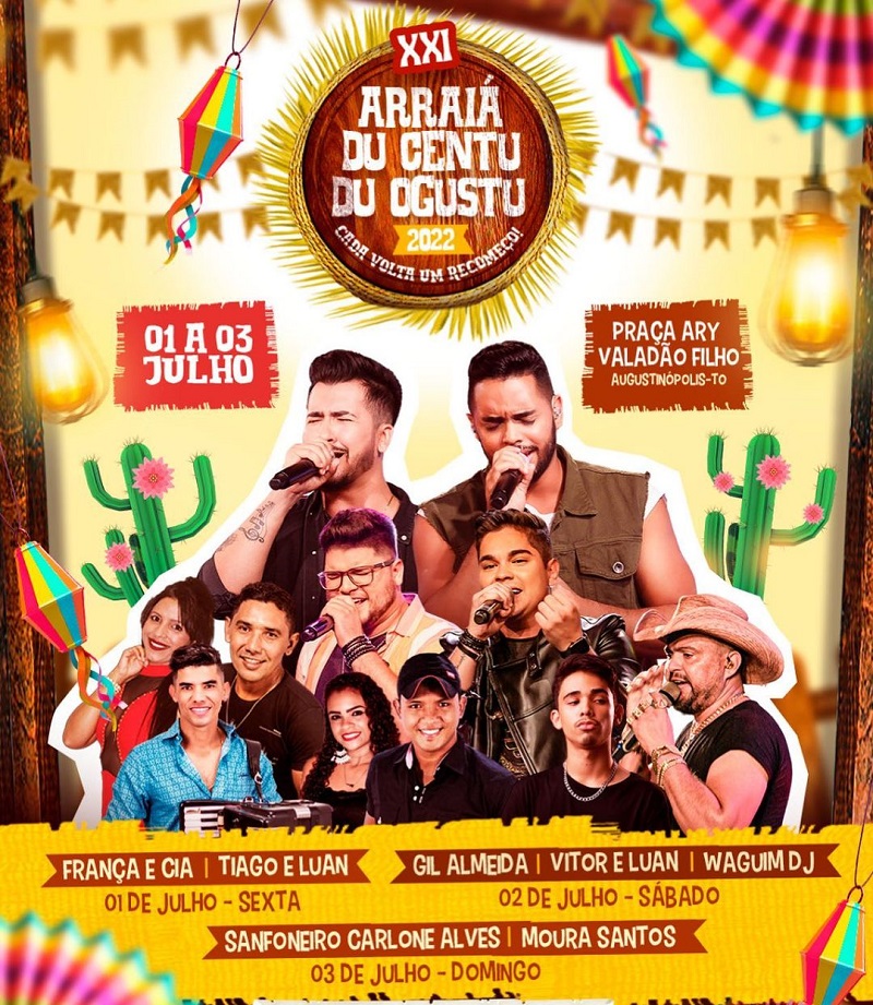 Acontece dos dias 1ª a 3 de julho, na cidade de Augustinópolis, no Bico do Papagaio, a 21ª edição do “Arraiá Du Centu Du Ogustu”, uma das maiores e mais tradicionais festas juninas da região, que volta a ser realizada depois do arrefecimento a pandemia de Covid-19.