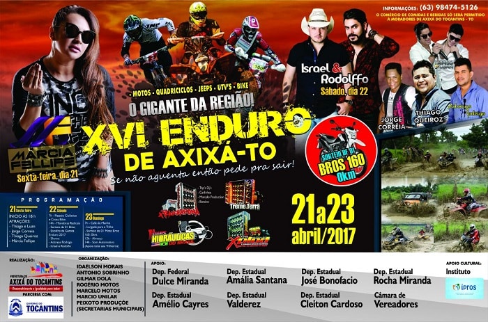 Com grandes atrações definidas para a programação, entra em contagem regressiva o maior enduro da região. O 16ª Enduro de Axixá terá os cantores nacionais Márcia Fellipe e a dupla Israel & Rodolffo, mantendo o nível dos últimos anos, no grande palco de atrações da festa.