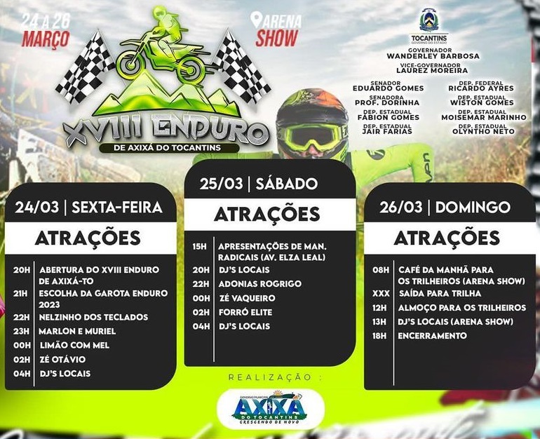 A cidade de Axixá, no Bico do Papagaio, receberá nos dias 24, 25 e 26 de março, a 18ª edição do Enduro. O maior evento do seguimento na região, contará com diversas atrações nacionais, como a banda Limão com Mel, Zé Vaqueiro, Zé Ottavio e muito mais. Além do excelente entretenimento, o evento contará também com a presença de diversos tipos de motos de competição.