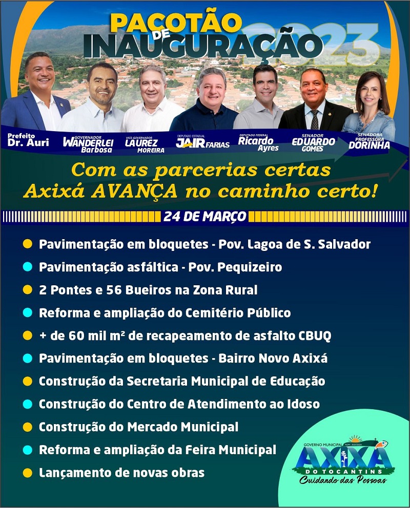 O município de Axixá, no Bico do papagaio, prepara para o próximo dia 24 de março, o lançamento do maior pacote de inaugurações na região. Os benefícios são fruto de parcerias da Prefeitura Municipal com o Governo do estado e parlamentares.