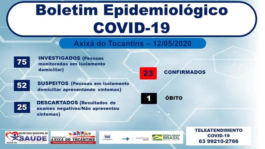 O Município de Axixá do Tocantins registrou, nesta terça-feira (12), 23 casos confirmados de pessoas com covid-19 e a primeira morte pela doença na cidade. Conforme o boletim epidemiológico divulgado pela Secretaria Municipal de Saúde, outras 52 pessoas estão em isolamento domiciliar apresentando sintomas da doença. Além disso, mais 75 pessoas estão sendo investigadas pela Secretaria de Saúde. Moradores da cidade estão assustados com o aumento de casos na cidade.