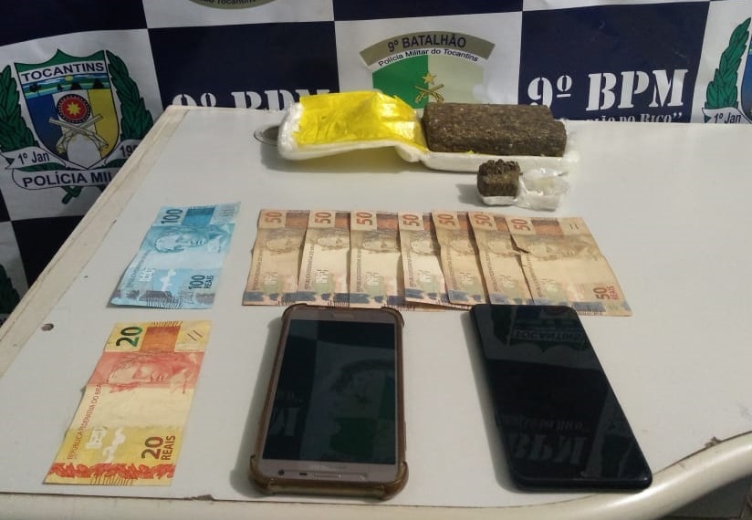 Durante a abordagem os policiais militares localizados na mochila do menor duas porções de substância análoga à maconha prensada, pesando 446,4 gramas; uma quantia de R$ 470,00 reais em espécie e um aparelho celular. Em poder do homem de 44 foram localizados R$ 10,00 reais também em dinheiro e um aparelho celular.