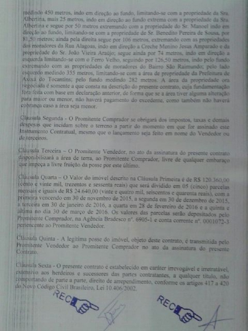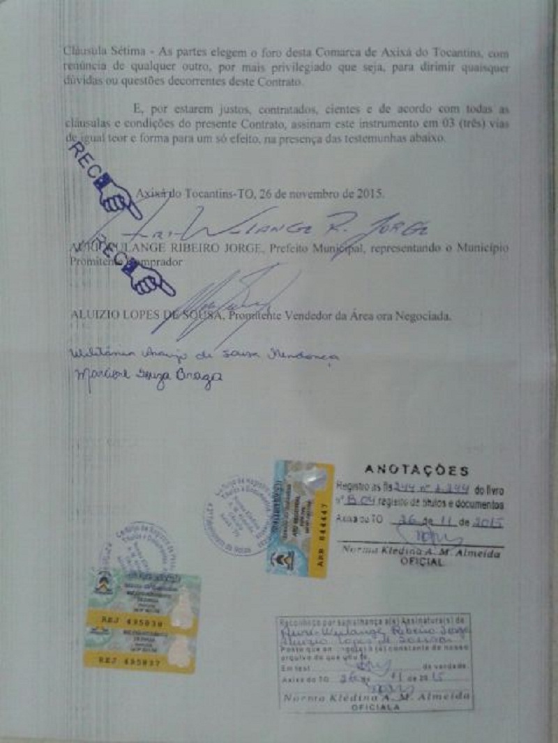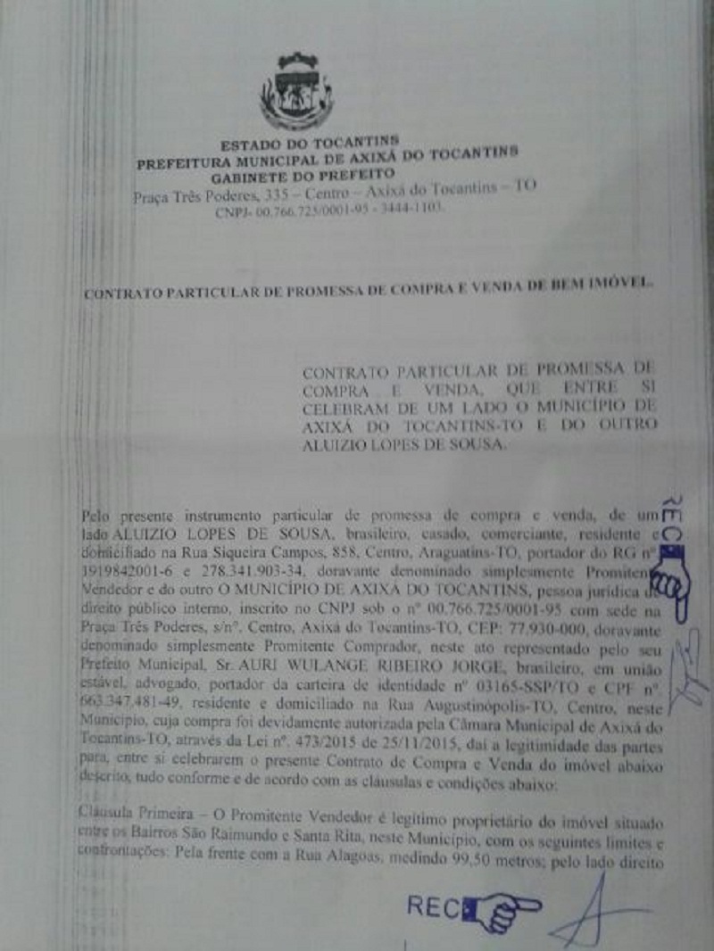 Aloísio que mora em Araguatins, disse que foi procurado pelo prefeito, Auri-Wulange Ribeiro Jorge (PRB), interessado em adquirir o imóvel para a implantação de um loteamento popular. O comerciante afirmou que já estava em um outro processo de venda do terreno, mas que para desistir, precisava de garantias do prefeito sobre a efetiva aquisição do imóvel. Foi quando Auri teria entrado de forma pessoal usando seu próprio nome como uma espécie de garantidor, até que o projeto fosse efetivamente aprovado na Câmara. “O que ele tratou comigo ele cumpriu. O projeto foi aprovado pela Câmara na segunda-feira, dia 23, daí o prefeito já me procurou para que o município assumisse o negócio, como vocês podem ver no contrato entre a minha parte e o município”, disse Aloísio apresentando a documentação.