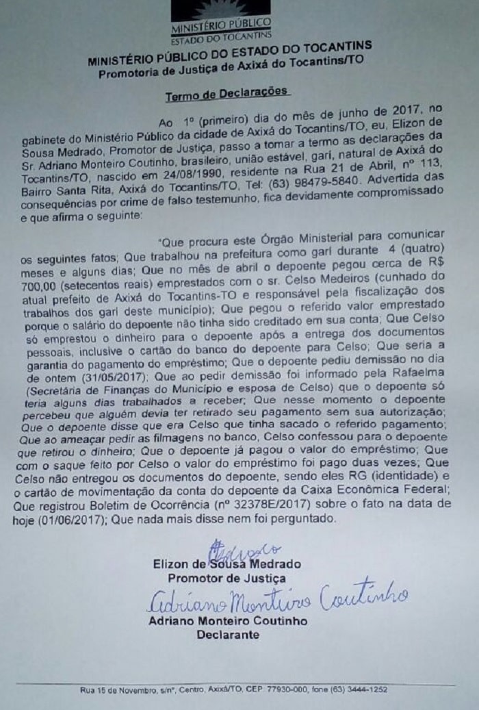 A denúncia foi feita pessoalmente pelo próprio ex-funcionário que resolveu delatar a situação. Adriano Monteiro Coutinho, era gari, e declarou ao promotor de Justiça, Elizon de Sousa Medrado, que trabalhou para a Prefeitura Municipal, durante cinco meses. Com os sucessivos atrasos nos pagamentos, ele se viu necessitado a pegar emprestado com Celso Medeiros, responsável pela fiscalização dos serviços de limpeza da cidade, a quantia R$ 700,00. Ainda segundo o gari, Celso dispôs o dinheiro mediante entrega de documentos pessoais e cartão bancário, que serviram como garantia do recebimento da dívida.