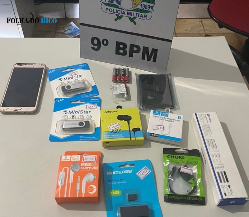 Com o individuo foi encontrado 03 pendrive, 01 aparelho celular Samsung, 02 fones de ouvido, 02 carregadores; 01 SSD, 05 (pilhas 3A) e 01 chave falsa usada para entrar no estabelecimento.