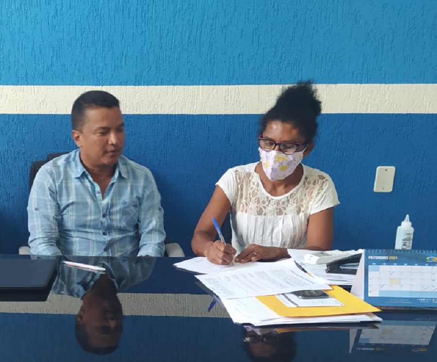 Prefeito Auri e presidente do SINSEA durante assinatura de acordo