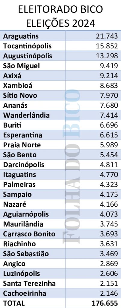 No Bico do Papagaio, o eleitorado para as Eleições 2024 é de 176.655 eleitores aptos a votar, segundo dados do Tribunal Regional Eleitoral, nos 27 municípios que compõem o Bico do Papagaio politicamente.