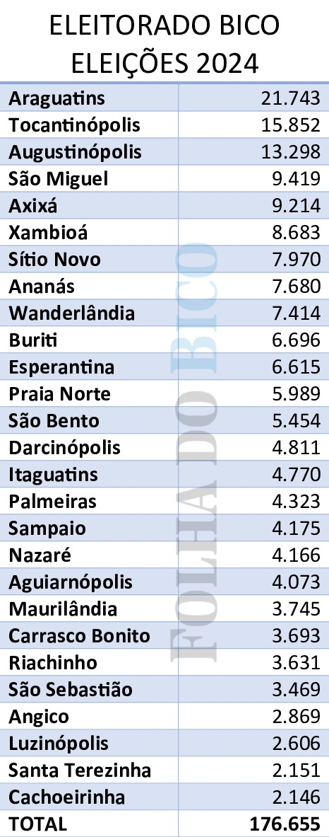 No Bico do Papagaio, o eleitorado para as Eleições 2024 é de 176.655 eleitores aptos a votar, segundo dados do Tribunal Regional Eleitoral, nos 27 municípios que compõem o Bico do Papagaio politicamente.