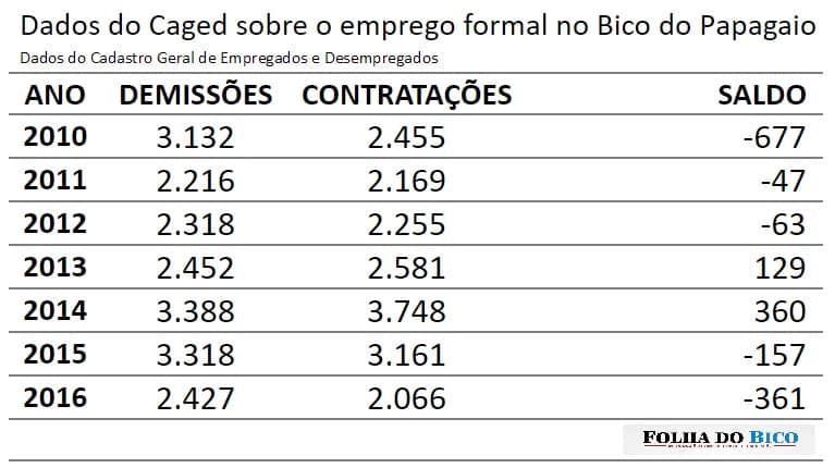 O Bico do Papagaio teve em 2016 um número de demissões maior que de contratações no setor formal. Ao todos foram 2.427 dispensas contra e 2.066 admissões, provocando uma variação de mais de 17% negativa. O saldo negativo dos doze meses do ano foram de 361 vagas de trabalho formal fechadas na região.
