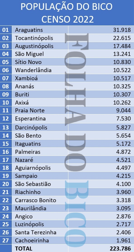 Araguatins continua sendo o mais populoso município da região, com 31.918 mil habitantes, seguido por Tocantinópolis com 22.615 e Augustinópolis 17.484.