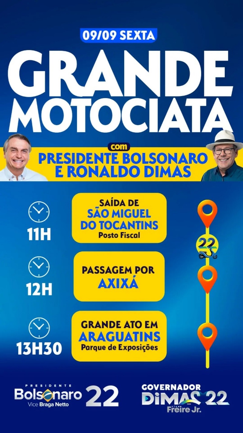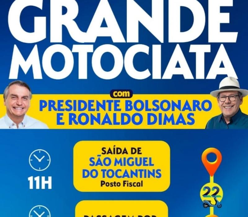 O candidato a governador Ronaldo Dimas (PL-MDB-Podemos) e o presidente da República e candidato à reeleição, Jair Bolsonaro (PL), promovem, nesta sexta-feira, a partir das 11 horas, uma grande mobilização política com uma motociata e atos políticos de campanha eleitoral.