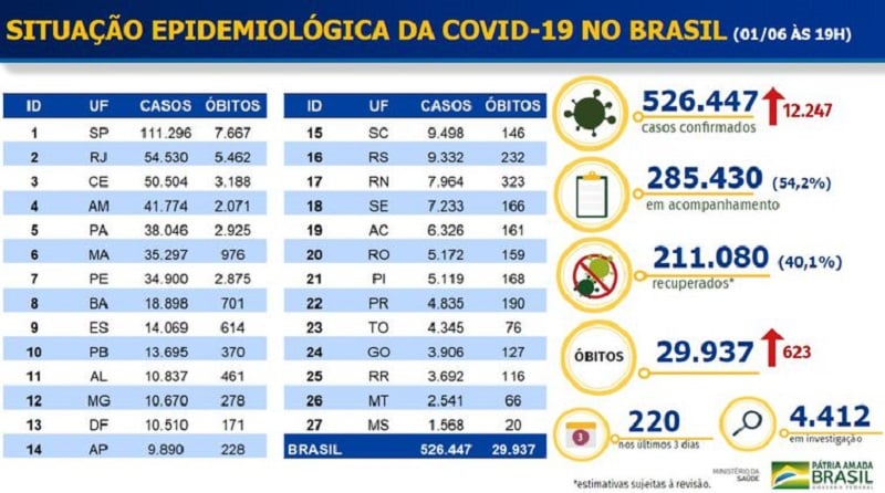 O balanço diário divulgado pelo Ministério da Saúde trouxe 12.247 novas pessoas infectadas pela Covid-19, nesta segunda, 1º, totalizando 526.447. O resultado marcou um acréscimo de 2,3% em relação ao dia anterior, domingo, 31, quando o número de pessoas infectadas estava em 514.200.