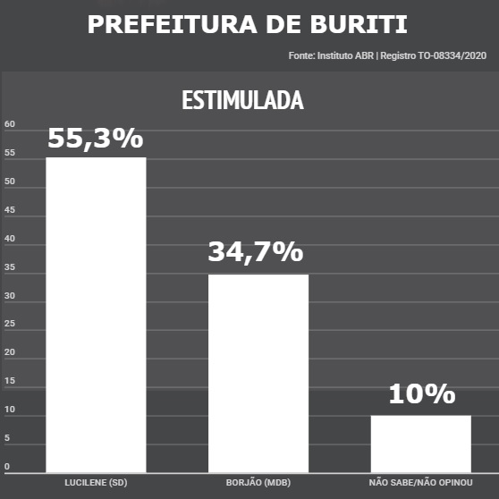 O Instituto ABR (iABR) divulgou nesta quarta, 28, uma pesquisa de intenção de votos para prefeito de Buriti, município do Bico do Papagaio. O levantamento ouviu 300 eleitores no dia 24 de outubro. Confira os resultados.