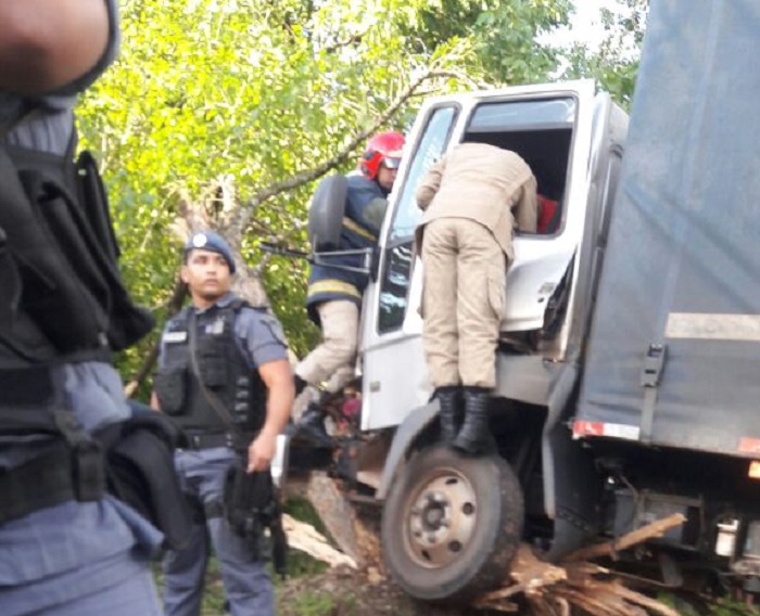 O caminhão acabou perdendo controle e batendo em uma árvore.