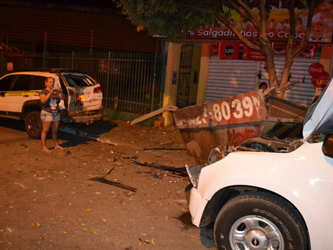 1440324909-217399325Na madrugada deste domingo, no Centro de Imperatriz, o motorista de uma caminhonete perdeu o controle do veículo e acabou colidindo com um contêiner de entulho, que foi arrastado até bater na traseira de um táxi. Os dois veículos ficaram parcialmente destruídos.Ninguém ficou ferido no acidente. (iMirante)