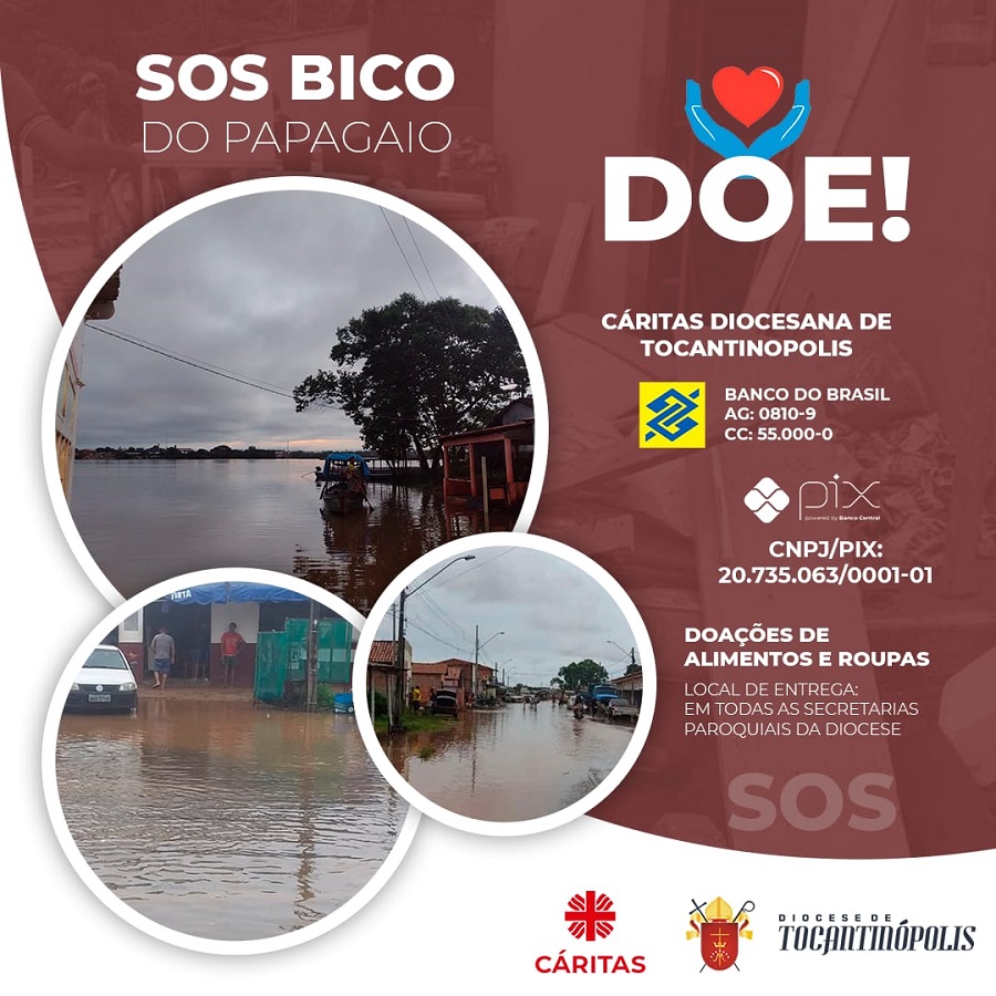 A Diocese de Tocantinópolis/Cáritas Diocesana de Tocantinópolis está promovendo a Campanha SOS Bico do Papagaio, em favor das famílias atingidas pelas fortes chuvas na região. Você poderá ajudar fazendo a doação de alimentos ou roupas na secretaria paroquial da sua paróquia ou através do Pix da Cáritas Diocesana.