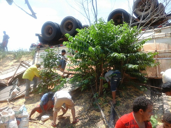 O motorista de um carro que passou pelo local do acidente informou que a carreta carregada de sacos de milho foi “trancado” por um caminhão durante uma ultrapassagem.