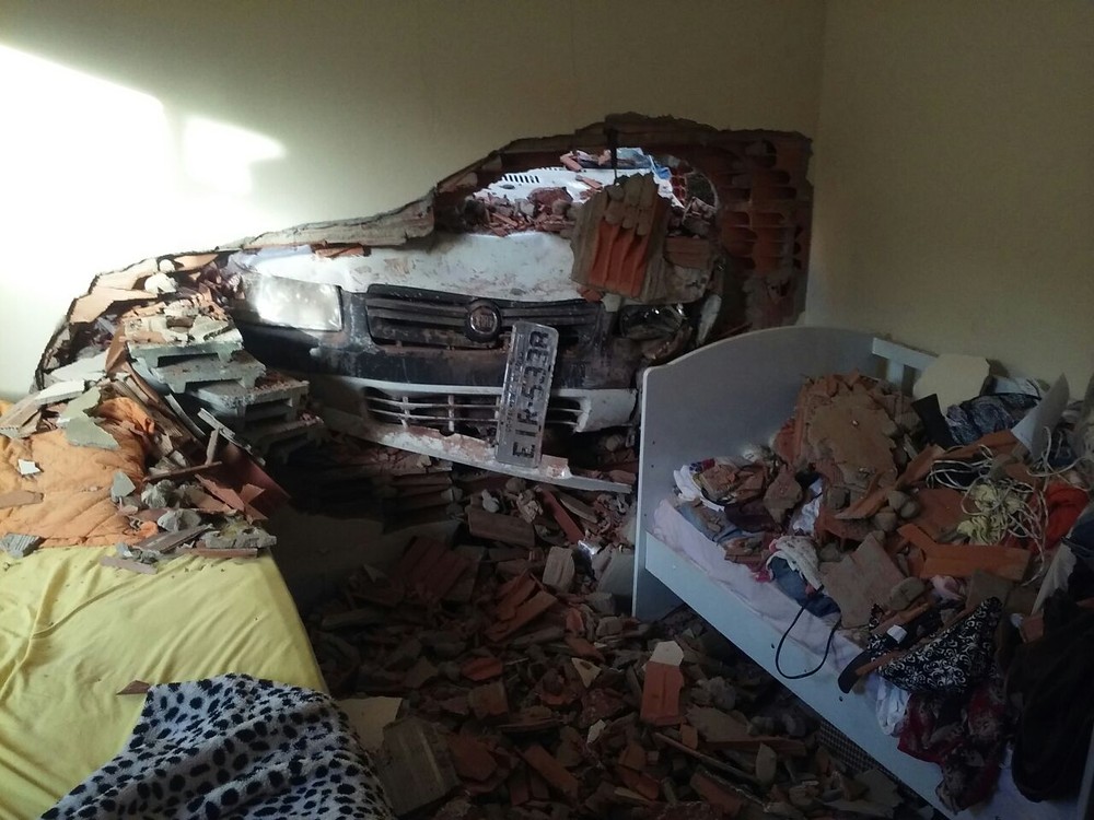 O motorista tem 23 anos e disse para a polícia que perdeu o controle do veículo. Fotos do local mostram que a frente do carro abriu um buraco na parede e jogou escombros em cima de um berço e uma cama de casal.