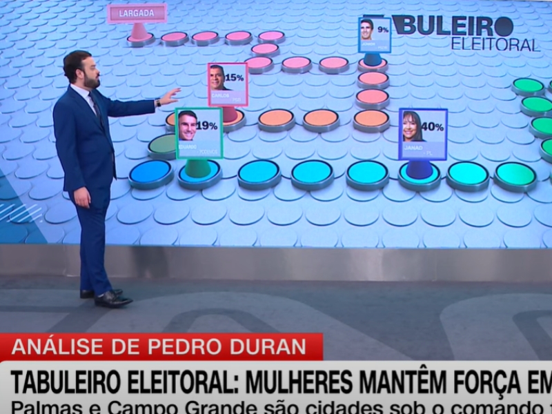 Na reportagem, o jornalista mostra as posições do tabuleiro eleitoral, comenta sobre os principais nomes que almejam ocupar o paço municipal e diz: “Olha a vantagem da Janad ali na frente, 40%. Você tem aí uma posição de destaque, da liderança dela nesse cenário eleitoral, de modo que o segundo colocado aparece muito atrás com 19%,” enfatizou. O Tabuleiro Eleitoral usa como base o Índice CNN, que é um agregador de pesquisas eleitorais, compiladas pelo Ipespe Analítica.