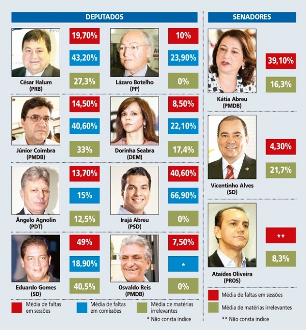 Dos oito deputados federais do Estado, três parlamentares com índices de falta em sessões do plenário acima da média da Casa que é de 17,1%. Eduardo Gomes (SD) é o que tem mais faltas, 49% das sessões com ausência. Ele é seguido de Irajá Abreu (PSD) (40%) e César Halum (PRB) (19,7%). Completando a bancada temos: Júnior Coimbra (PMDB) (14,5%); Ângelo Agnolin (PDT) (13,7%); Lázaro Botelho (PP) (10%), Dorinha Seabra (DEM) (8,5%) e Osvaldo Reis (PMDB (7,5%). A lista muda quando o assunto são as faltas em comissões (ver quadro). O levantamento reúne tanto faltas justificadas quanto injustificadas.