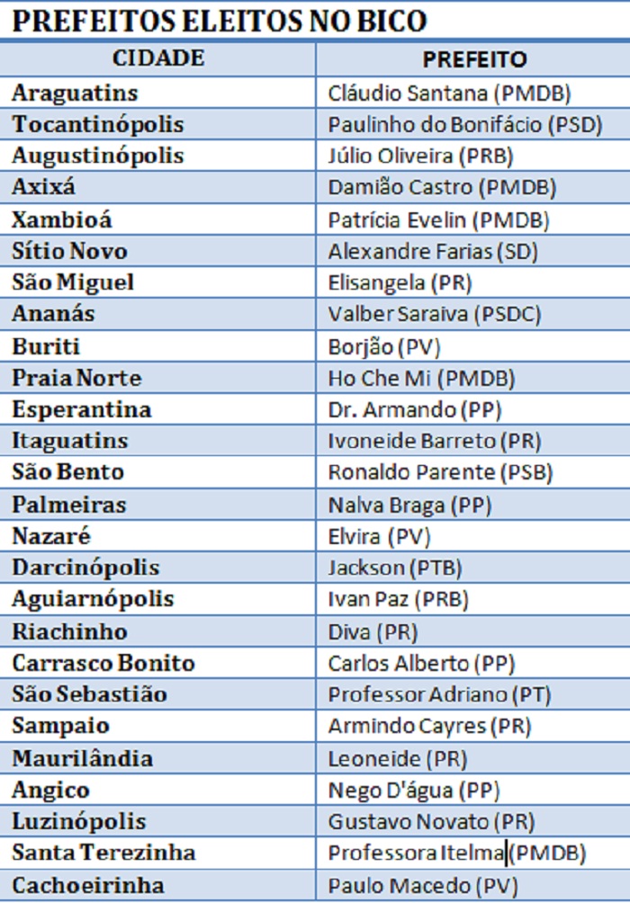 Publicidade Publicidade Bico do Papagaio Confira a lista de prefeitos eleitos no Bico ELEIÇÕES 2016 By Folha do Bico 3 de outubro de 2016 0 2722 Share WhatsAppPrintTelegramFacebookTwitterCopy URL Folha do Bico Noticias Relacionadas ARAGUATINS: Atividade pedagógica usa tribunal simulado para aprofundar leitura 15 de dezembro de 2025 AUGUSTINÓPOLIS: Avenida Goiás troca de nome e passa a se chamar Avenida Antônio do Bar 15 de dezembro de 2025 AUGUSTINÓPOLIS: Homenagens ao pai e ao irmão levam Amélio Cayres a revisitar 40 anos de trajetória familiar 15 de dezembro de 2025 Share WhatsAppPrintTelegramFacebookTwitterCopy URL Previous articleARAGUATINS: Veja como ficou a composição da Câmara MunicipalNext articleAssis Ramos é eleito prefeito de Imperatriz-MA - Advertisement - - Advertisement - Ultimas noticias AÇAILÂNDIA: Adolescente é apreendido por assédio virtual contra professora do Pará 15 de dezembro de 2025 TOCANTINÓPOLIS: Gestão prisional diz ter cumprido diligências e reforça padrão legal de funcionamento 15 de dezembro de 2025 TOCANTINÓPOLIS: Irregularidades estruturais e falta de medicamentos mantêm presídio sob fiscalização 15 de dezembro de 2025 ARAGUAÍNA: Interno do sistema prisional conquista 2º lugar em Medicina após Enem PPL 15 de dezembro de 2025