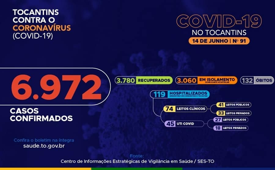 Atualmente, o Tocantins apresenta 6.972 casos no total, destes, 3.780 pacientes estão recuperados, 3.060 pacientes estão ainda em isolamento domiciliar ou hospitalar e 132 pacientes foram a óbito.