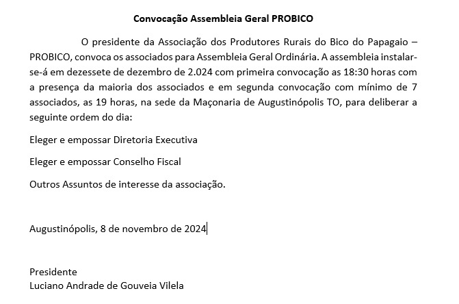 Publicidade Publicidade Geral Convocação Assembleia Geral PROBICO By Folha do Bico 8 de novembro de 2024 0 34 Share WhatsAppPrintTelegramFacebookTwitterCopy URL Folha do Bico Noticias Relacionadas PREFEITURA DE MAURILÂNDIA DO TO – ATO AVISO DE CONCORRÊNCIA ELETRÔNICA Nº 06/2025 – REPUBLICAÇÃO 2 de dezembro de 2025 PREFEITURA DE MAURILÂNDIA DO TO – ATO AVISO DE CONCORRÊNCIA ELETRÔNICA Nº 05/2025 – REPUBLICAÇÃO 2 de dezembro de 2025 PREFEITURA DE MAURILÂNDIA DO TO – ATO AVISO DE CONCORRÊNCIA ELETRÔNICA Nº 04/2025 – REPUBLICAÇÃO 2 de dezembro de 2025 Share WhatsAppPrintTelegramFacebookTwitterCopy URL Previous articleARAGUATINS: Município recebe Selo Unicef 2024 pelo compromisso com o direito de crianças e adolescentesNext articlePREFEITURA DE AXIXÁ DO TO – AVISO DE LICITAÇÃO – PREGÃO ELETRÔNICO Nº 012/2024 - Advertisement - - Advertisement - Ultimas noticias AUGUSTINÓPOLIS: Vigilante de abrigo é preso suspeito de abusar duas crianças 4 de dezembro de 2025 SÃO MIGUEL: Lixão é fechado e passa a ter acesso controlado sob novas diretrizes ambientais 4 de dezembro de 2025 ARAGUATINS: Insatisfeitos, Abmael, Chico Moura e Rafael Oliveira passam a votar com a oposição e complicam gestão Aquiles 4 de dezembro de 2025 ARAGUATINS: Com voto decisivo e comando da oposição, Airton se torna principal contraponto à gestão Aquiles 4 de dezembro de 2025
