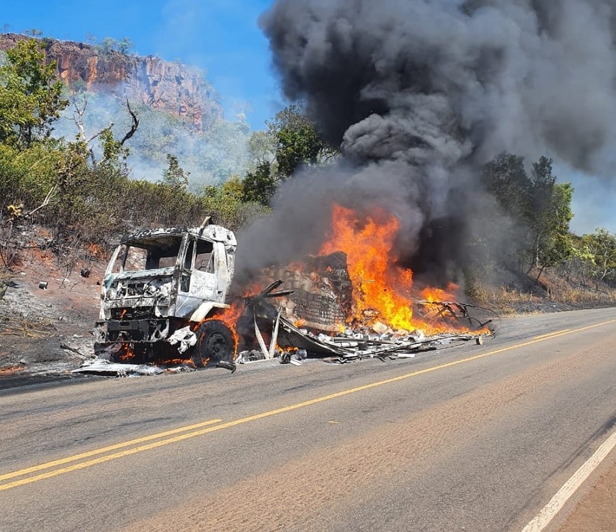 Um caminhão ficou totalmente destruído após pegar fogo na BR-153 perto de Darcinópolis, na região do Bico do Papagaio. De acordo com o Corpo de Bombeiros, o veículo estava carregado com pneus. Ninguém se feriu.