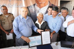 O Governador Siqueira Campos condecorou neste domingo, 1º de abril, no grau de comendador, José Pereira da Silva (Sinó), pioneiro de Darcinópolis. Sinó completou 100 anos de idade no dia 19 de março passado. Ele recebeu o título de comendador da Ordem do Mérito Tocantins pelo seu exemplo de vida honesta e trabalhadora e pela sua luta em defesa da criação do Estado do Tocantins. O ato foi assinado pelo Governador Siqueira Campos e pelo chanceler da Ordem, Renan de Arimatéa Pereira, na presença de lideranças locais e da comunidade de Darcinópolis.