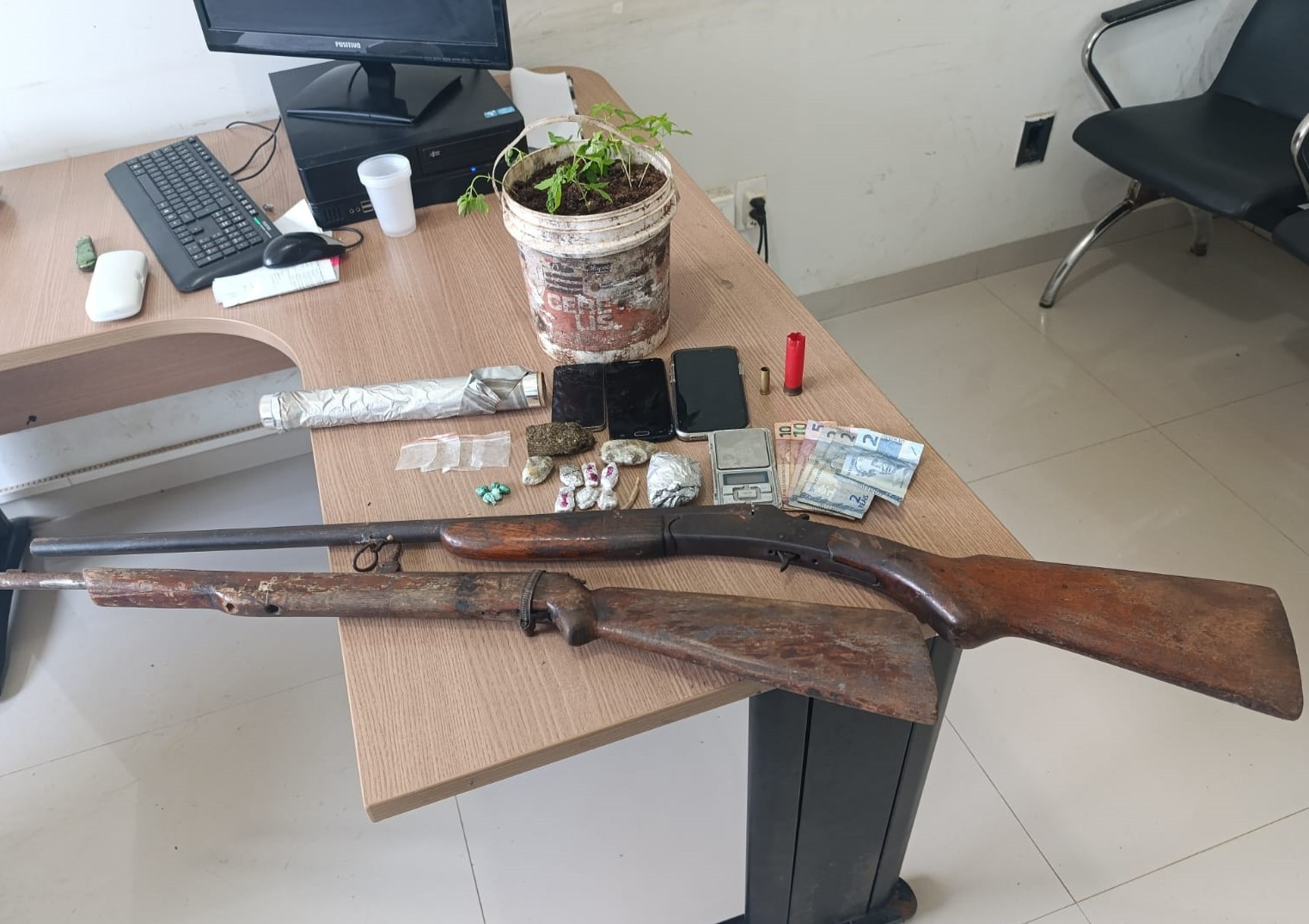 A Polícia Militar do Tocantins prendeu três pessoas por tráfico de drogas e porte ilegal de arma de fogo em Darcinópolis. A ação, realizada na tarde deste domingo, 23, resultou na apreensão de porções de crack e maconha, uma balança de precisão, duas espingardas e sete pés de maconha.