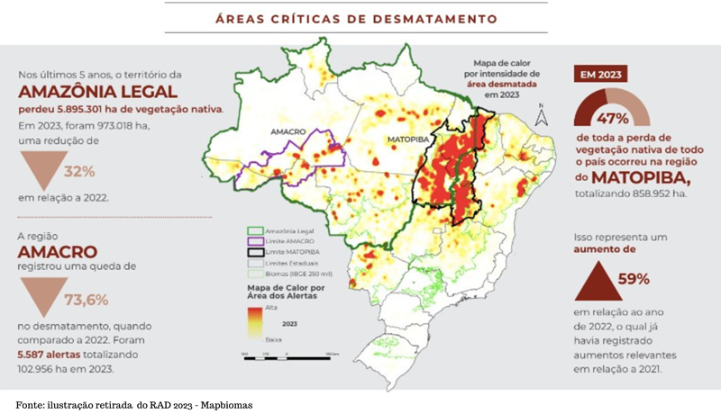Também aponta que três em cada quatro hectares desmatados no Cerrado em 2023 (74%) foram no Matopiba, região que abrange os estados do Maranhão, Tocantins, Piauí e Bahia.