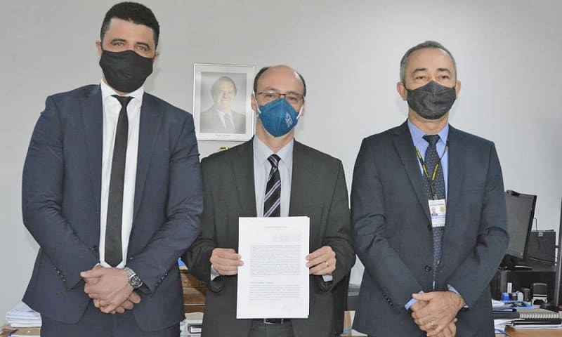 Heber Luis (E); Cristiano Sampaio (C) e Wanderci Aparecido (D) depois da assinatura do termo de cooperação