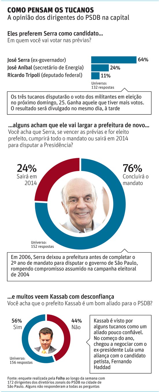 Aníbal tem o apoio de 24% dos dirigentes que concordaram em revelar suas preferências à Folha. Tripoli tem 11%. Para 24%, Serra não concluirá seu mandato na prefeitura se vencer a disputa partidária e for eleito em outubro. Eles acham que Serra será novamente candidato à Presidência da República em 2014, embora ele prometa cumprir o mandato de prefeito até o fim se for eleito. (Folha Online)