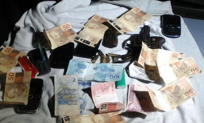 Com eles foram encontrados uma arma de fogo tipo revolver calibre 38, telefones celulares e a quantia R$669,00. Os suspeitos, o dinheiro e objetos encontrados foram conduzidos à Delegacia de Plantão para as providências legais.