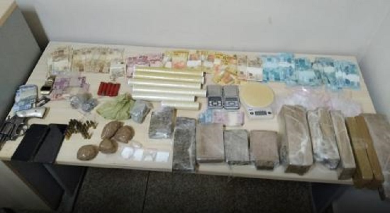 Com os indiciados foram apreendidos 13 tabletes de maconha, seis porções e nove flaconetes de cocaína, 47 cabeças de crack, três balanças de precisão, uma arma de fogo revolver cal 38; 17 munições cal 38, cinco munições cal 32, cinco munições cal 28 e a quantia de R$ 1.538,00.