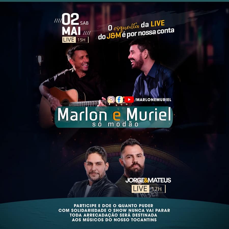 A live de Marlon e Muriel começa às 15h no YouTube que você pode acessar e se inscrever pelo link clicando AQUI e ainda servirá de esquenta para a da dupla Jorge e Mateus, que vai ao ar às 17. As doações serão feitas através de uma conta oficial e tudo o que for arrecadado vai para a classe musical.